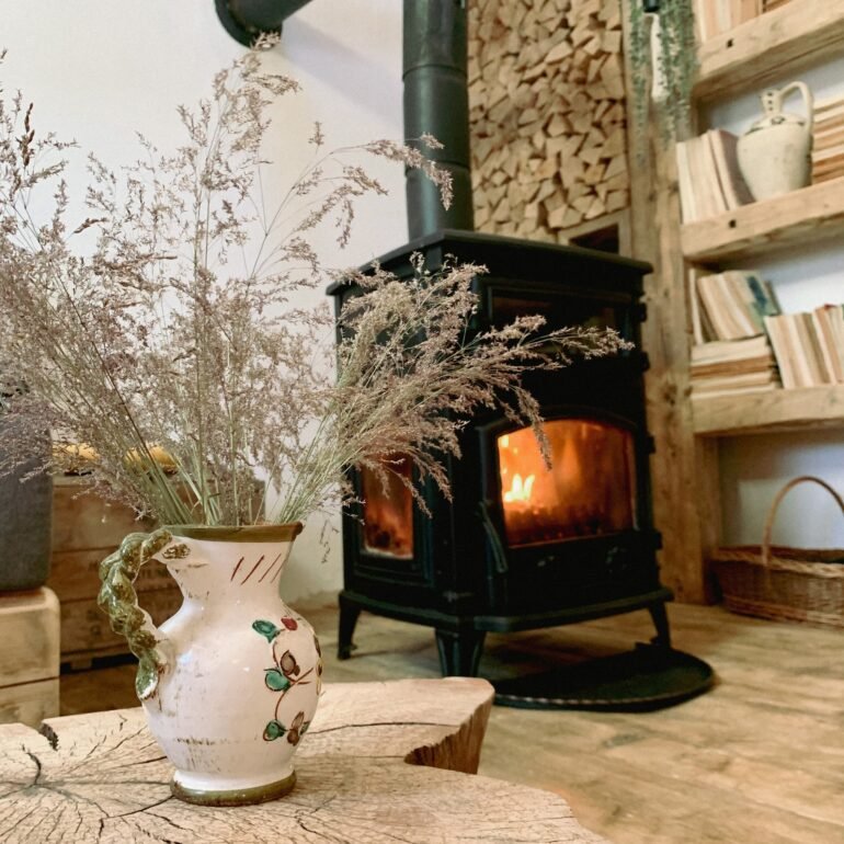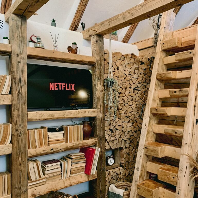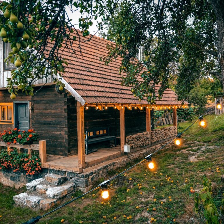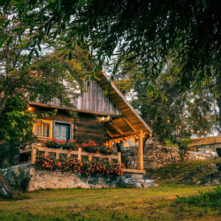 The wooden interior glows with natural textures, featuring custom-built shelving, a crackling wood stove, and inviting reading nooks. The loft bedroom, soft lighting, and thoughtful design create a space that feels both intimate and inspired. Outside, the cottage is framed by blooming flower boxes, stacked firewood, and a covered dining area perfect for cool evening meals under string lights.